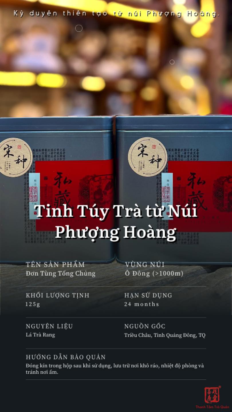 Đơn Tùng Tống Chủng là một loại trà Ô Long nổi tiếng với hương vị đặc trưng mạnh mẽ và sắc nét. Trà được chế biến từ những lá trà lớn, thu hái thủ công từ các cây trà cổ thụ trên núi Ô Đông. Trà có màu nước trong vắt, sắc vàng óng ánh cùng hương thơm nồng nàn của hoa và gỗ, kết hợp với vị trà đậm đà, tạo nên một trải nghiệm thưởng trà đầy quyến rũ. Đơn Tùng Tống Chủng mang trong mình những giá trị văn hóa truyền thống, đồng thời là một loại trà lý tưởng cho những ai yêu thích hương vị mạnh mẽ.